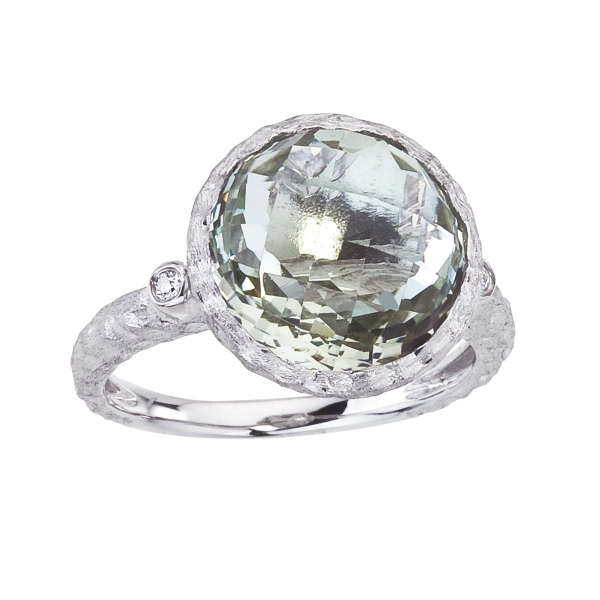 14k Brushed White Gold Round Green Amethyst And Diamond Ring