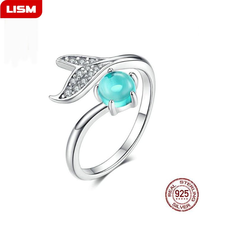 Bamoer Mermaid Ring 925 Sterling Silver Blue Ocean Stone Tear Fish