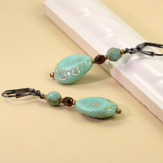 Seafoam Green Earrings Gold Etching Sea Green Jewelry Gold Etsy