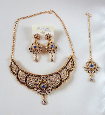 Indian Traditional Bollywood Gold Dark Blue Necklace Earrings