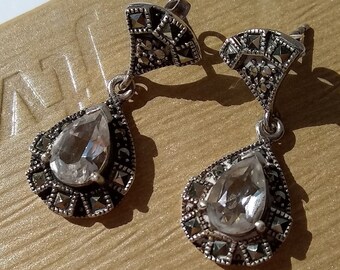 Marked A925 Jewelry Sterling Onyx Marcasite Pierced Earrings