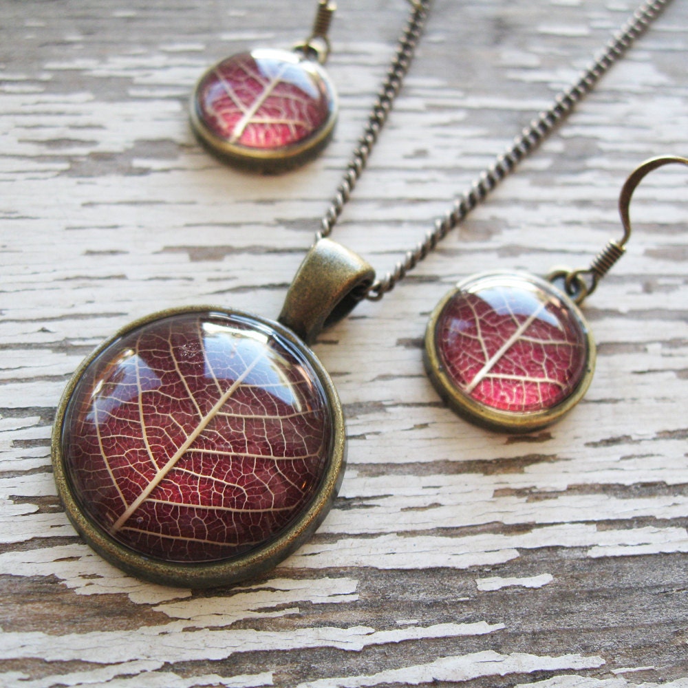 Real Botanical Jewelry Set Maroon Leaf Jewelry Set