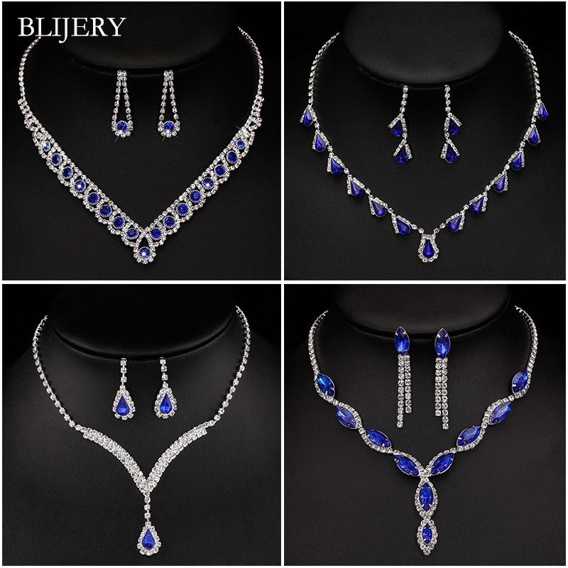 Blijery Fashion Royal Blue Crystal Bride Wedding Jewelry Sets For