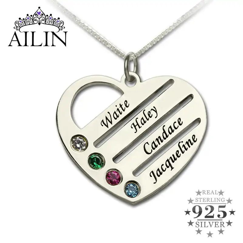 Family rings make a wonderful gift option for special occasions like mothers day. The ancient birthstones were updated in 1912 by the national association of jewelers and through the years popular favorites grew the original 12 to include garnet amethyst aquamarine bloodstone diamond emerald pearl moonstone alexandrite ruby peridot sardonyx sapphire opal tourmaline topaz citrine turquoise zircon and tanzanite. Personalized family rhodium plated name and birthstone heart pendant 18 with 2 extender.
