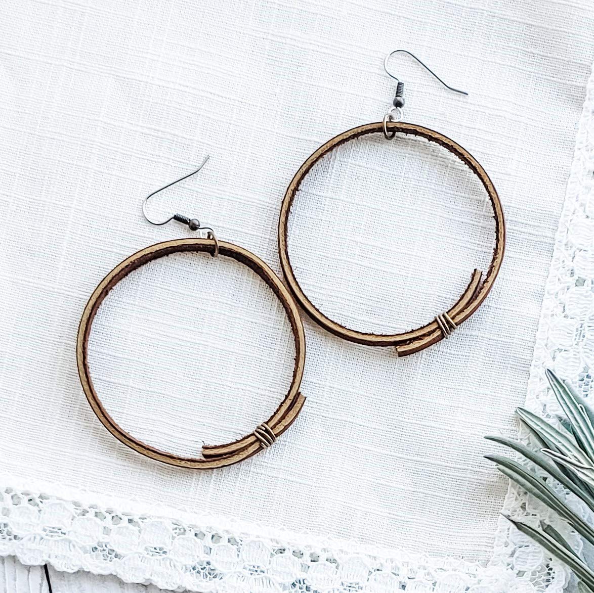 Amazon Com Brown Leather Rustic Hoop Earrings Minimal Hoop