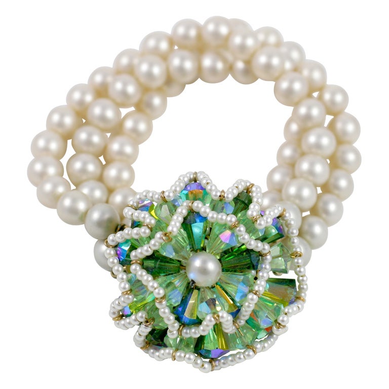 Vendome Pearl Bracelet With Large Green Stone Flower Costume