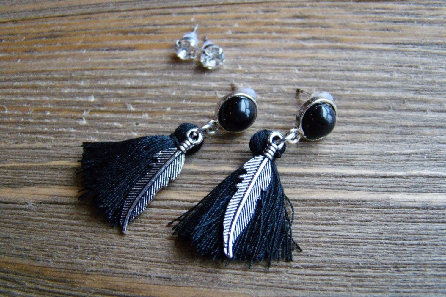 Silver Feather Black Tassel Rhinestone Dangle Earrings Set Boho