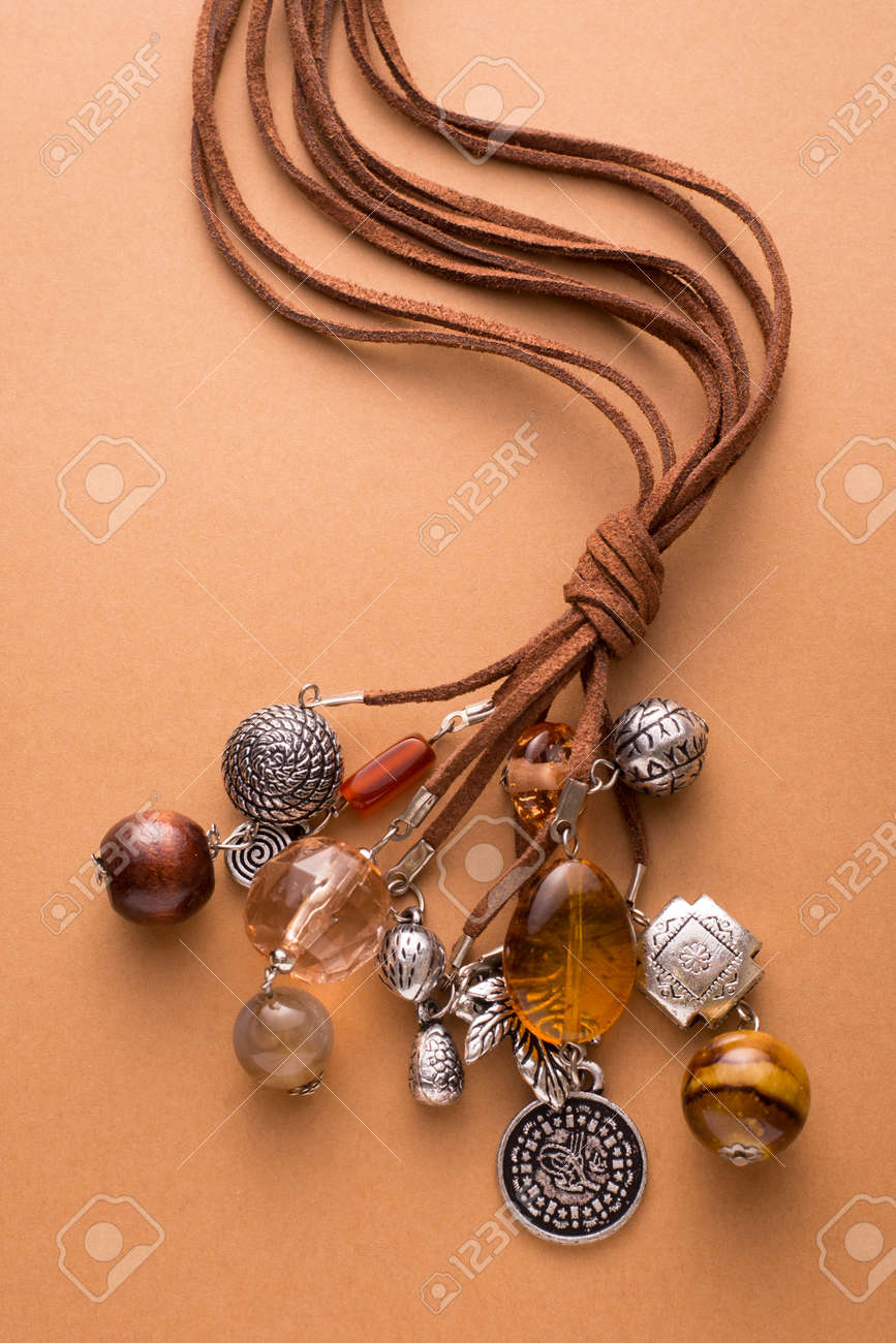 High Angle Still Life View Of Handmade Artisan Jewellery On Tan