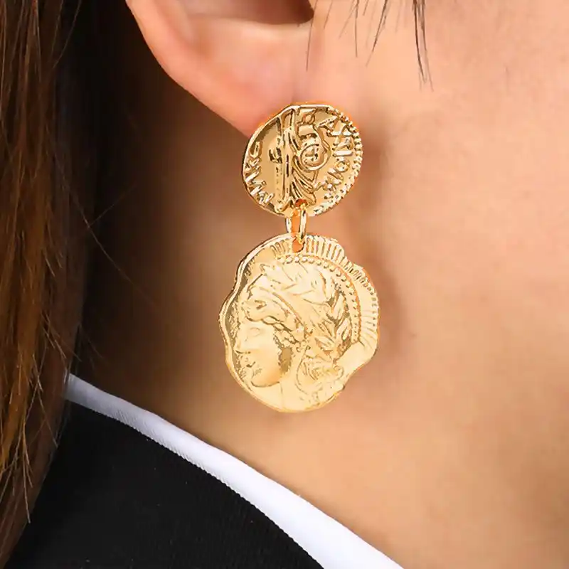 Antique Gold Medusa Coin Portrait Baroque Drop Earrings Women