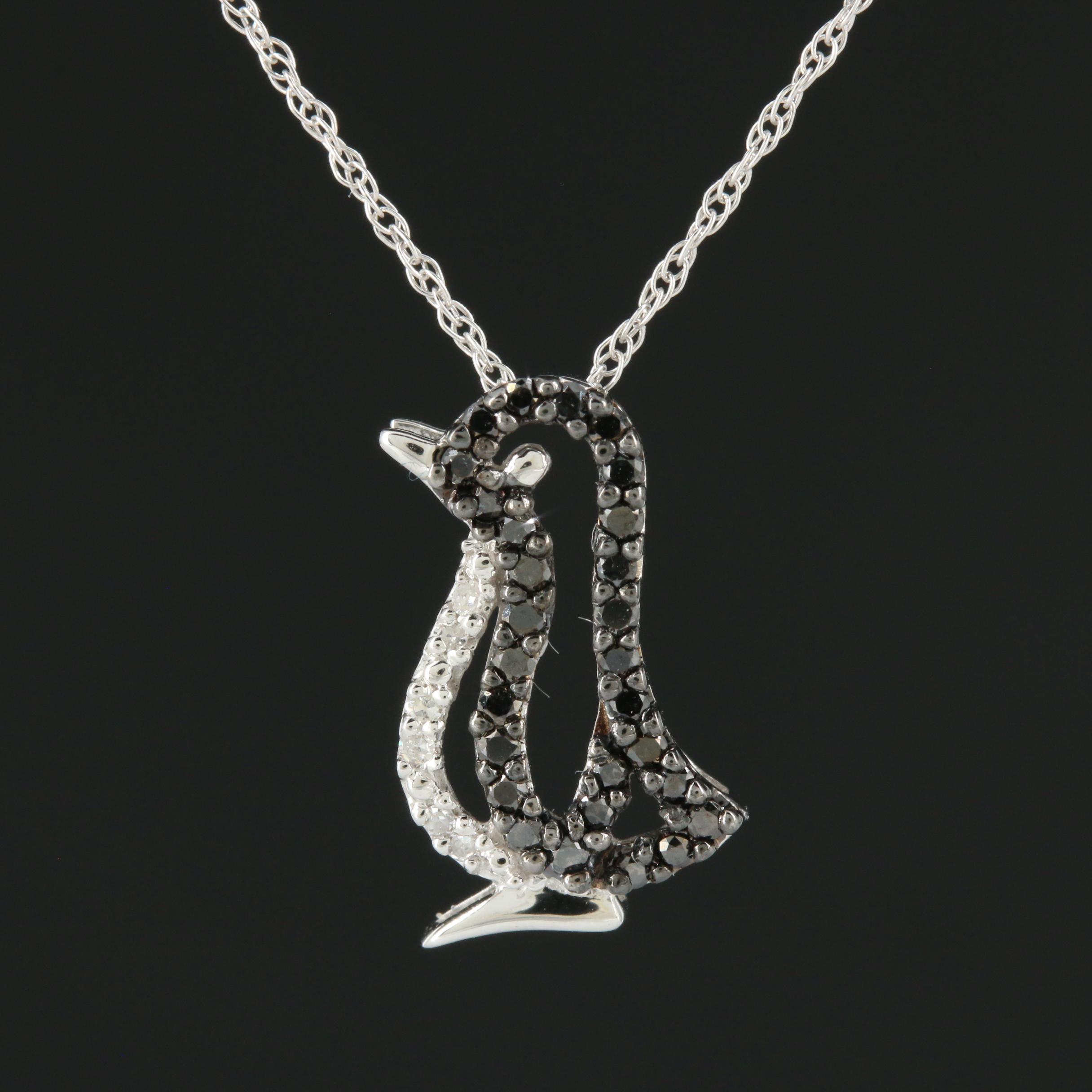 Modern 10k White Gold White Black Diamond Penguin Pendant