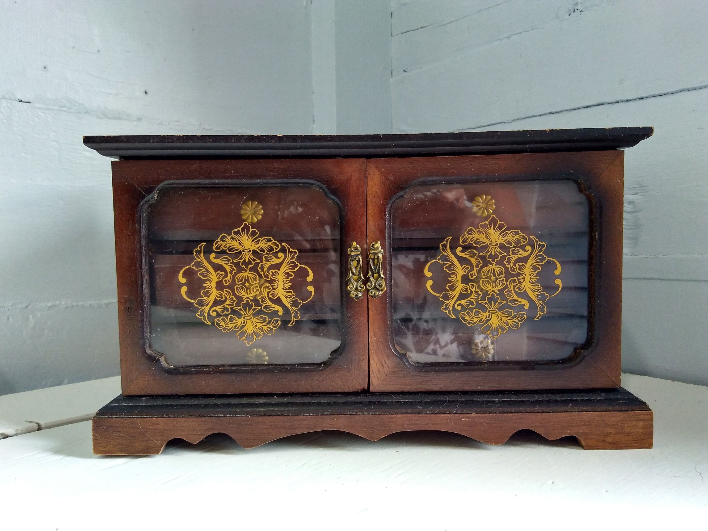 Vintage Jewelry Box Large Wood With Doors And Drawers For Her