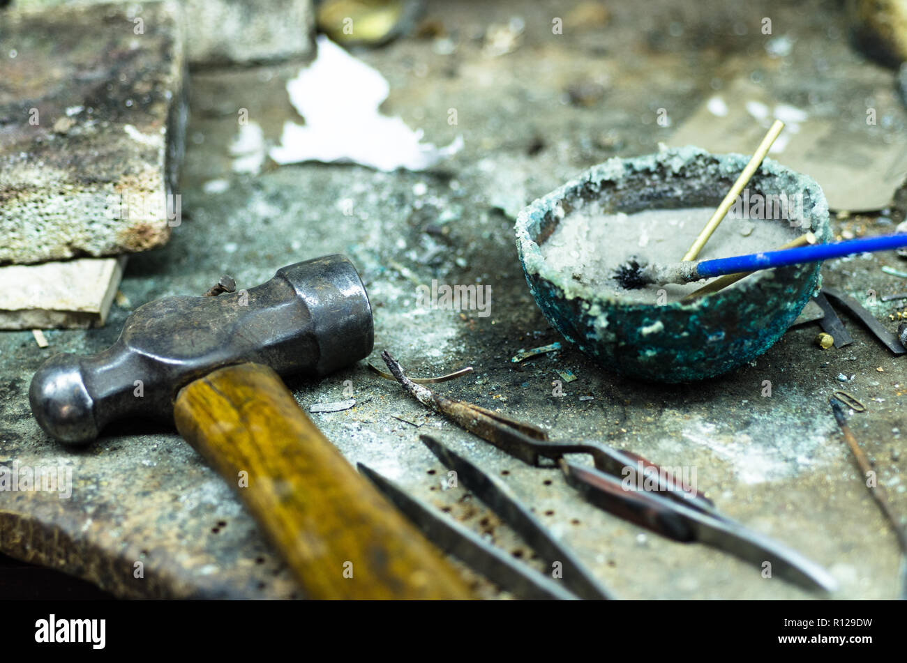 Top View Of Different Goldsmiths Tools On The Jewelry Workplace