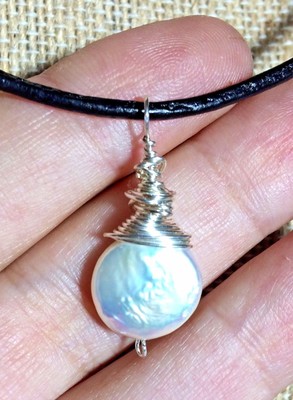 Spun White Coin Pearl 925 Sterling Silver Leather Necklace