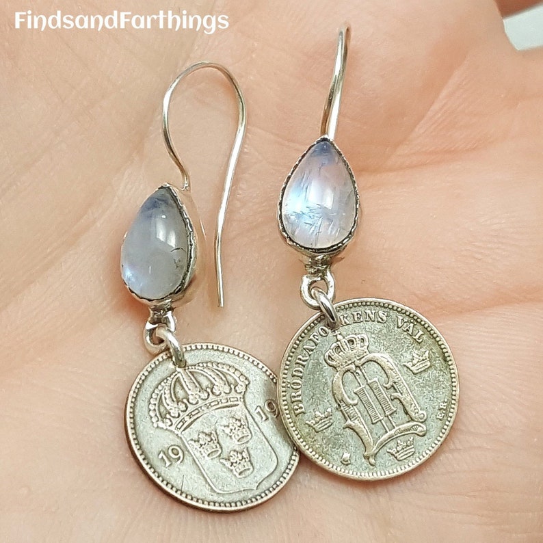 Antique Swedish Silver Coin Earrings Rainbow Moonstone Etsy